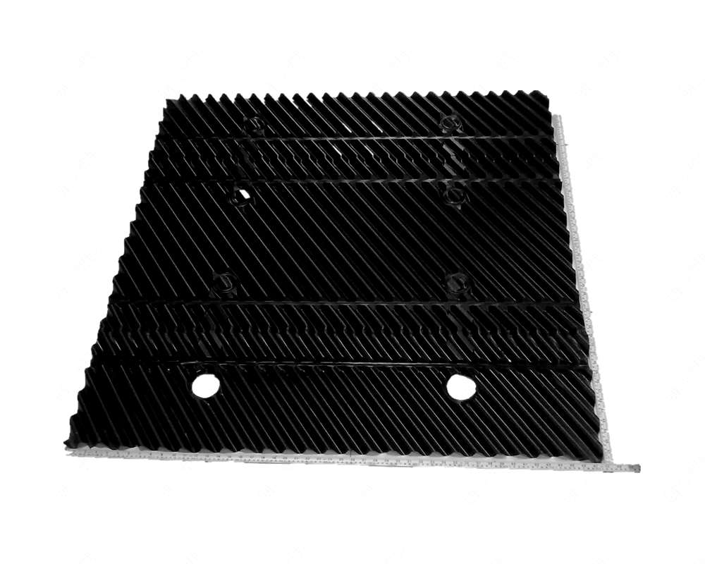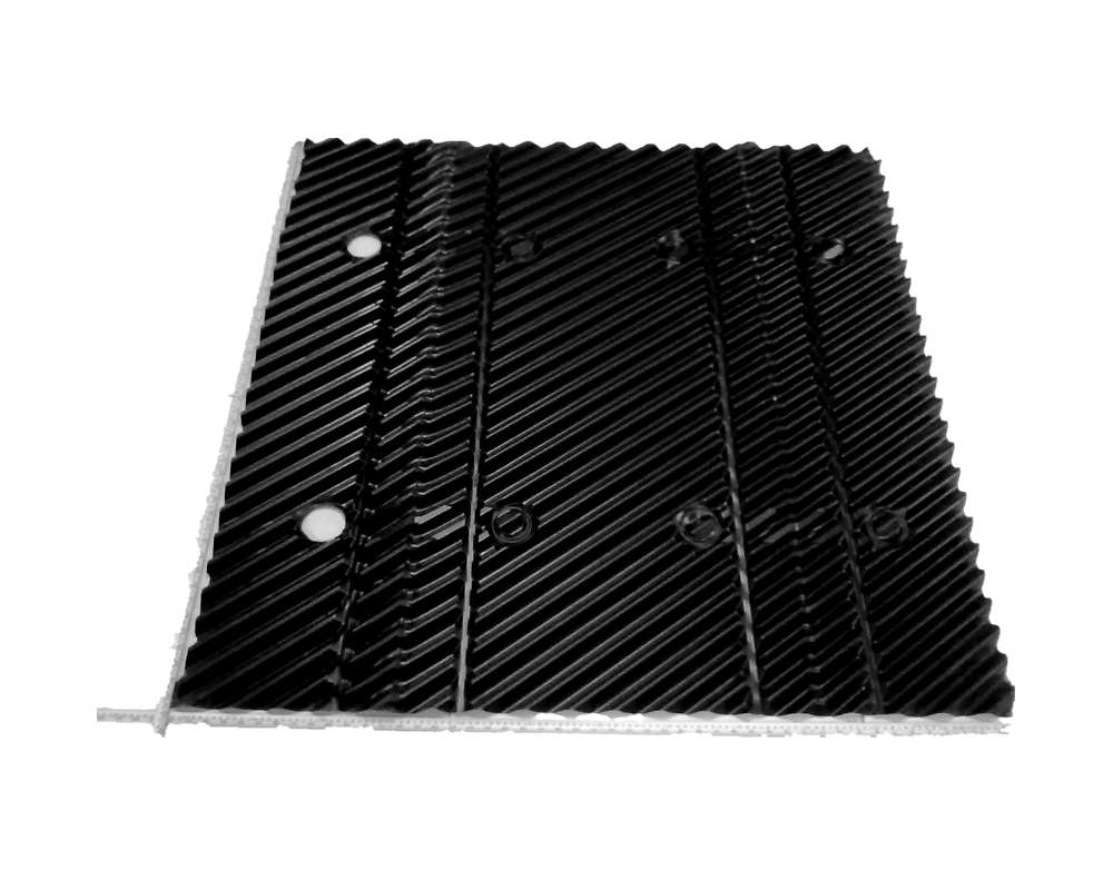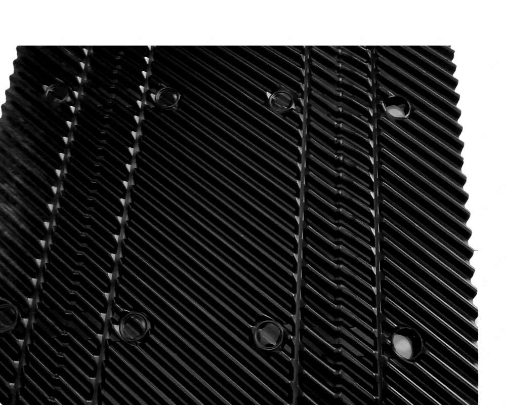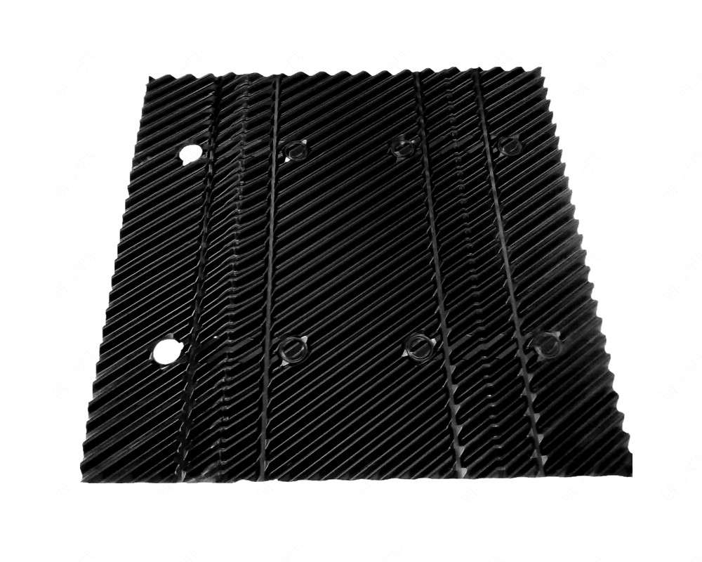 冷卻塔塔芯填料是由優(yōu)質(zhì)PVC聚乙烯片正負(fù)壓及吸塑而成,主要采用了水紋波形、梯形波、點波形、S波型、人字波形填料,散熱面積增長系數(shù)大,水流在板面上分布性能好,水和空氣流經(jīng)板面時擾動大等優(yōu)點。填料不易變形,耐高溫,抗老化,且阻燃性能好,風(fēng)阻系數(shù)小。安裝方便,易清洗,運(yùn)輸方便該散熱填料采用粘接式及懸掛式,安裝簡便,便于清洗,且成功解決了粘接填料因吸積垢、自重而產(chǎn)生變形,且變形后積垢更加嚴(yán)重、難于清洗的問題。填料阻燃性能好,阻燃氧指數(shù)指標(biāo)為42.7,每立方米組裝體質(zhì)量約為15 kg—30kg/m3,組裝高度為0.5m—3.0m,交錯布置,對于塔壁周邊異形塊可視現(xiàn)場布置情況,按實際尺寸切割、安裝。